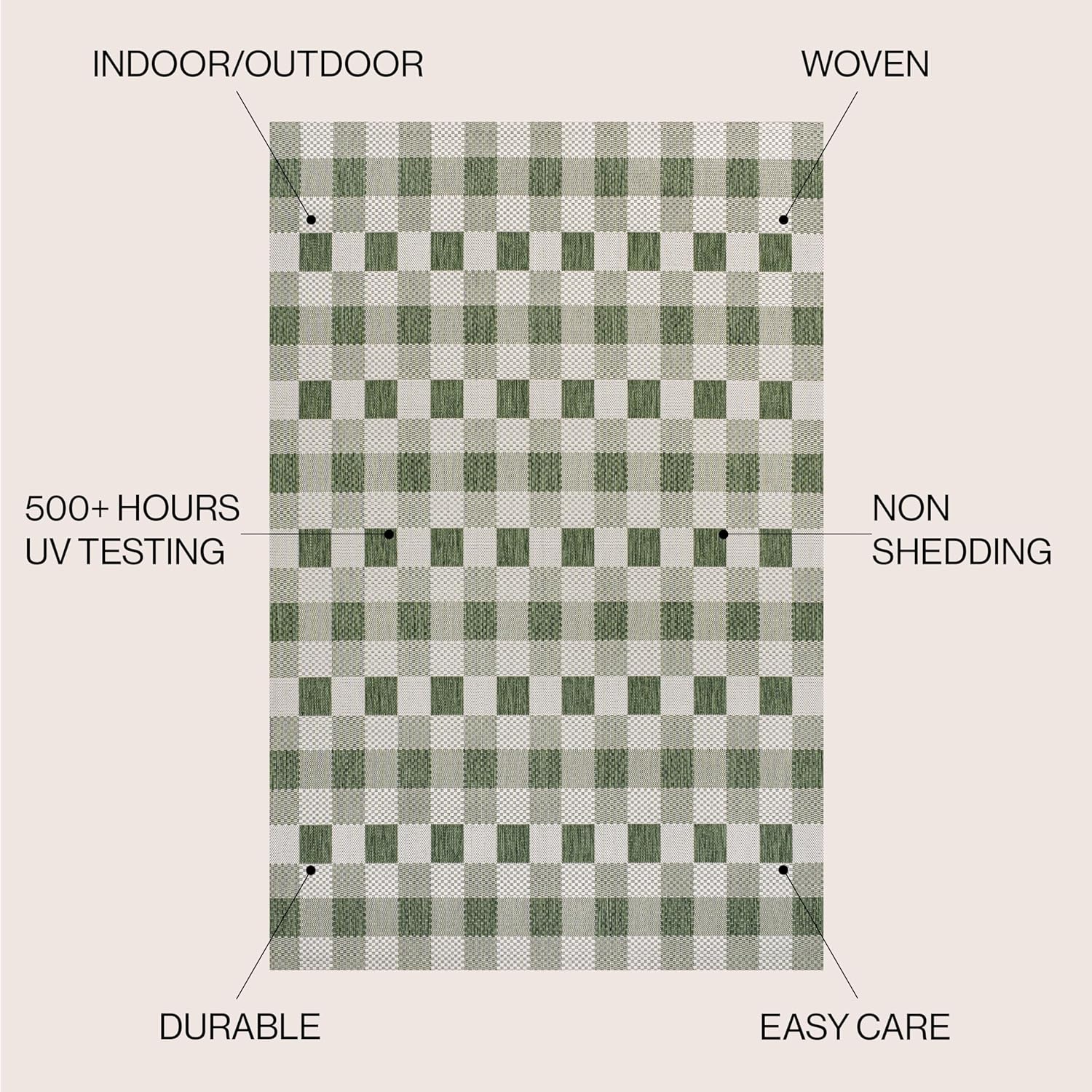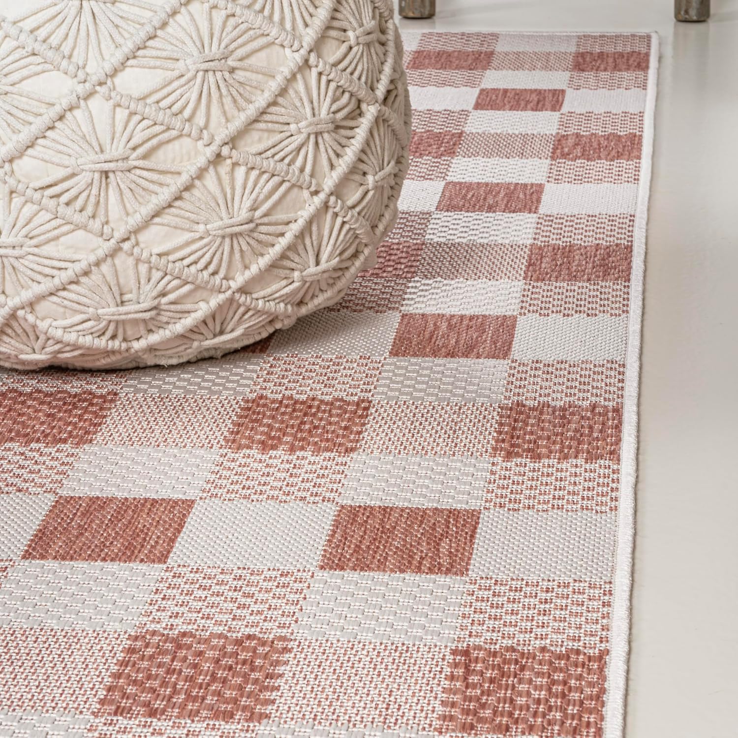 Our modern version of a gingham rug is inspired by traditional French Country designs. It's made from durable polypropylene fibers woven into an updated geometric pattern. Use this easy-care rug outdoors on a porch, or in the bedroom, living room or dining room.
