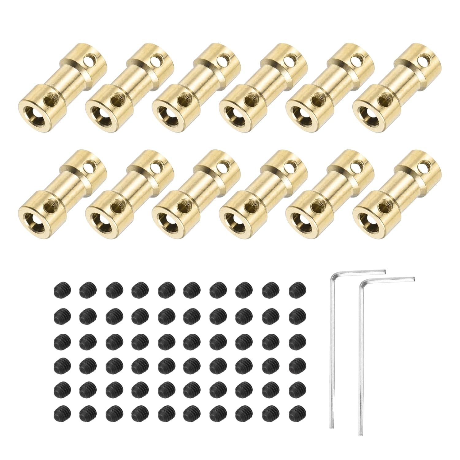 What is this?The Brass Shaft Coupler Coupling Connector is made of pure brass, sturdy, reliable and strictly functional. Used for connecting the motor shaft and the hexagon wheel of the robot, cars, and other models.Suitable for model shaft connection, perfect accessories for RC Model motor, etc.What will I get?The size of flexible motor bearing coupling is here:Hole Diameter: 3mm to 4mm/0.12 to 0.16 inchOuter Diameter: 9mm/0.35 inchHeight: 20mm/0.79 inchMaterial: BrassPackage contains: 4pcs Brass Shaft Coupling with 16pcs Screws and 2pcs Hex WrenchAre there any advantages of the product?The brass bearing coupling characterized by high temperature resistance, corrosion resistance and oil resistance, long service life.make your shaft more stable, easy to install and replace.How to use it?Simple to install and easy to use.Mainly used to connect two optical shafts with different diameters, or to connect motors and optical shafts, or to connect shafts of different diameters.What should I notice?Please select the appropriate size before purchase