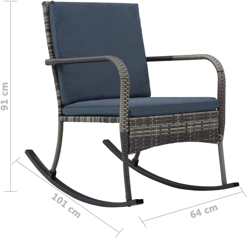 This rocking chair is aesthetically and ergonomically designed to make a comfortable as well as striking addition to your living room, patio or garden.Thanks to the weather-resistant and waterproof PE rattan, the rocking chair is easy to clean, hard-wearing and suitable for daily use. Its powder-coated steel frame makes it stable and highly durable. The thick, removable cushions are highly comfortable. The cushion covers with zips can be easily removed and washed.Delivery includes a rocking chair and two removable cushions. Assembly is really easy.Note 1): We recommend covering the set in the rain, snow and frost.Note 2): This item will be shipped flat packed. Assembly is required; all tools, hardware and instructions are included.Rattan color: BlackCushion color: Cream whiteChair material: PE rattan + power-coated steel frameCushion material: 100% polyesterDimensions: 25.2" x 39.8" x 35.8" (W x D x H)Seat height from the ground: 18"Armrest height from the ground: 27.6"Cushion cover washableEasy to assembleDelivery includes: 1 x rocking chair, 1 x seat cushion, 1 x back cushion