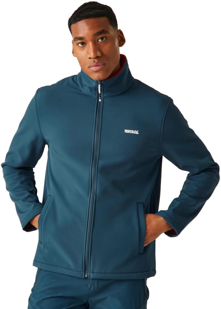 The men's Cera Softshell Jacket from Regatta is made of soft, warm-backed stretch fabric with a DWR (Durable Water Repellent) finish to provide wind and water resistance.
