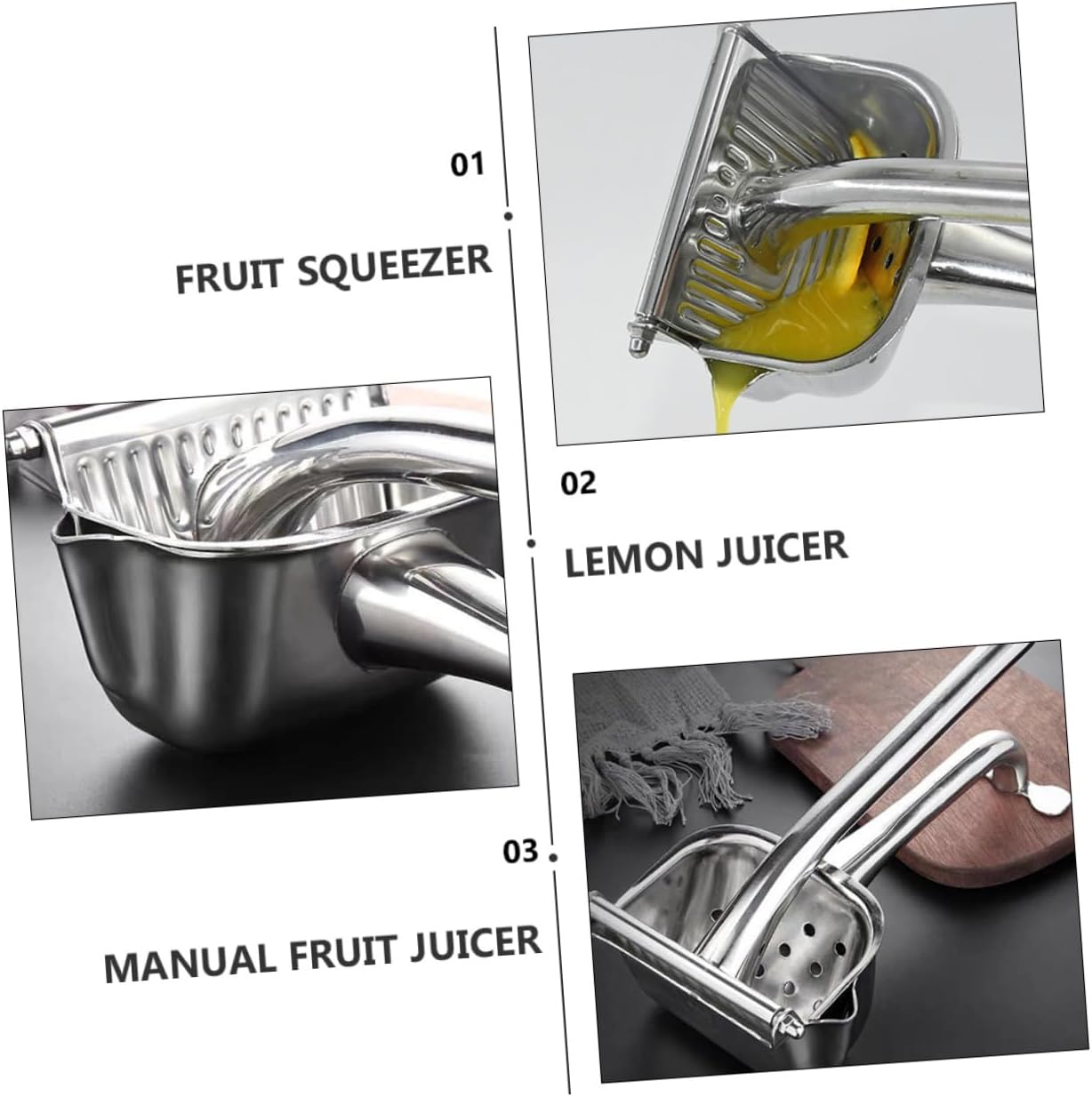 Package List 1 x Handheld Fruit Juicer Characteristics -Material: Stainless Steel handheld juicer squeezer. -Size: About 25.00X11.00X8.50cm/9.82X4.32X3.34inch manual fruit juicer. -Color: Silver, juice squeezer - Gets every out of lemons, and small oranges squeezer juicer. - Ergonomic design gives you a comfortable handle in pressing of the lemon manual juicer squeezer. - Easy to gain make refreshing and delicious drinks by yourself now with this innovative gadget portable manual juicer. - This manual lemon juicer help you get fruit juice easily heavy duty manual juicer. - An homemade accessory, enjoy your life and get more nutrition everyday fruit juice squeezer.Goods Descriptionportable manual juicer want to gain lemon juice easily without spending too much efforts? No need to be so troublesome anymore, for you have our practical lemon juicer, get lemon juice which contains nutrients and vitamins without the harmful additives.manual juicers A useful kitchen gadget for spending a healthy