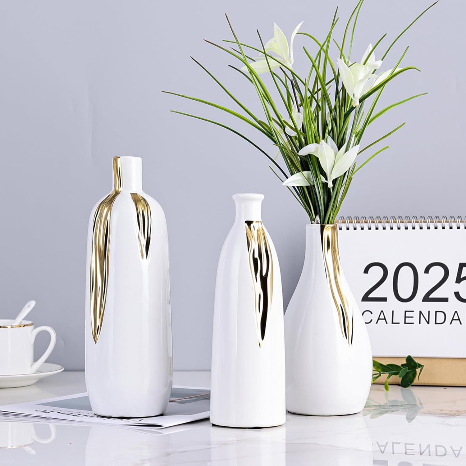 "Add a touch of elegance to your space with these stunning white and gold vases. Featuring a modern design with luxurious gold accents, these vases make a sophisticated statement in any room. Their combination of gold ceramic and smooth white porcelain creates a timeless look that fits seamlessly into luxury home decor for living room, dining areas, or offices. Whether you’re updating your mantle or creating a stylish centerpiece, these vases are designed to elevate any decor style. Crafted from high-quality ceramic, these gold ceramic vases are not only durable but also meticulously detailed. The smooth white finish contrasts beautifully with the polished gold, adding a refined touch to your home. Perfect for blending into a variety of decorative vases for living room settings, they pair perfectly with both modern and classic pieces. These decorative vases home accents are versatile and can be displayed on tables, shelves, or mantles. Their unique shape and sleek design bring a touch of sophistication to any corner of your home, complementing your existing white and gold decor effortlessly. Whether you're showcasing them on your mantle vase or using them as part of your art deco vase collection, they are sure to impress. Bring a stylish and elegant vibe into your living room or home with these carefully crafted vases. The circle vase design enhances any home decor, making them a perfect addition to modern spaces, minimalist interiors, or luxurious art deco settings. With their refined aesthetic and versatile design, these vases are the perfect way to introduce elegance into your living room or office. They effortlessly blend in with various styles, from classic to contemporary, making them an ideal choice for your home decor needs."