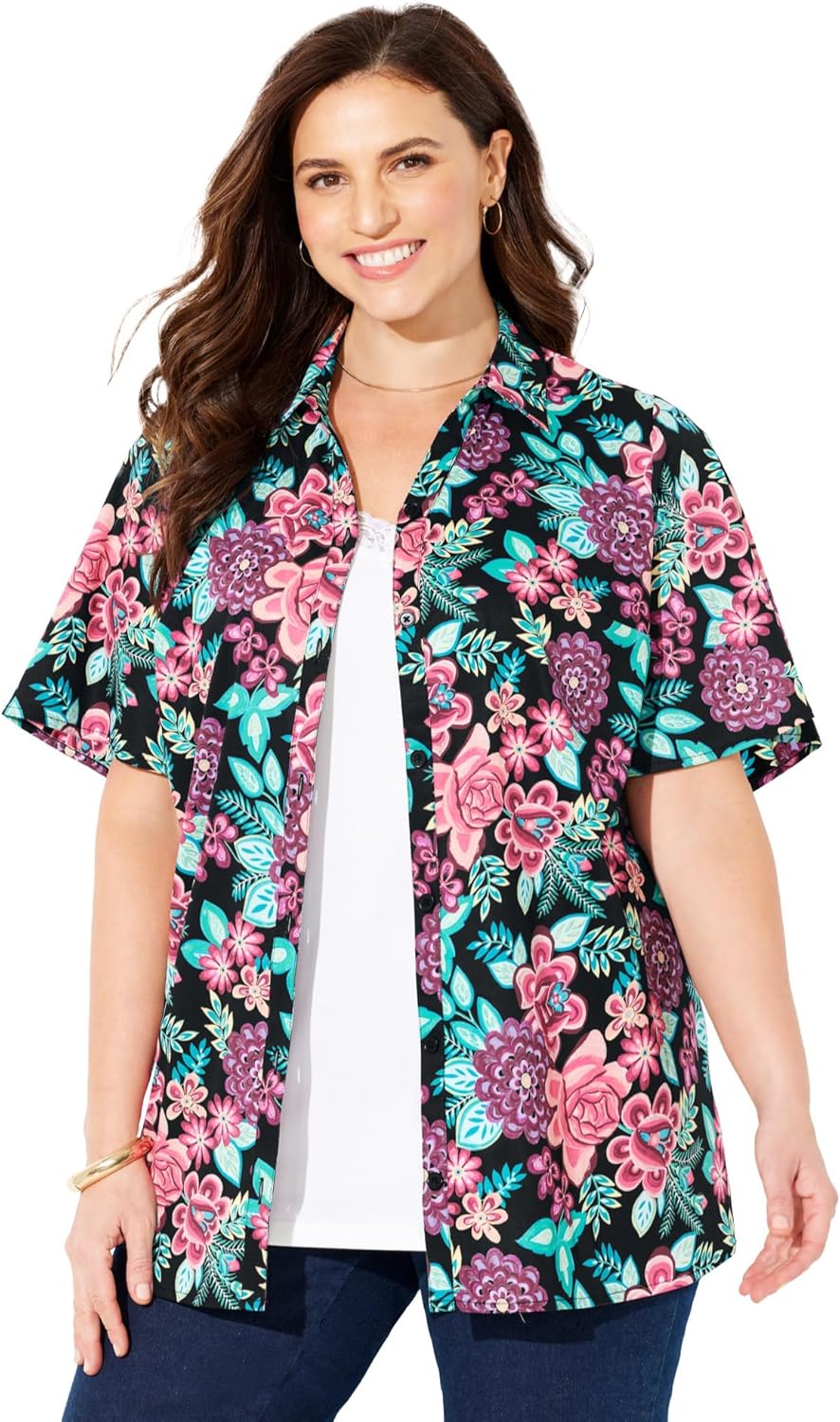 Your feel-good favorite Timeless Blouse is now available in short sleeves. This is the same georgette fabric and relaxed fit you know and love, with a notch neckline and soft flutter sleeves. Perfect for warmer days when you want to look a little more refined. FABRIC: Smooth opaque georgette fabric is lightweight, comfortable and cool to the touch. Floats aways from the body without clinging. FIT: Relaxed and easy. Shirt collar with notch neckline. Full buttonfront. Short flutter sleeves. 97% Polyester, 3% Spandexbr>Machine Washbr>Imported Plus Size Topbr>Front Length: Regular 31”, Petite 29”br>Plus Sizes 0X–6X, Petite Plus Sizes 0XWP–3XWPbr>Catherines