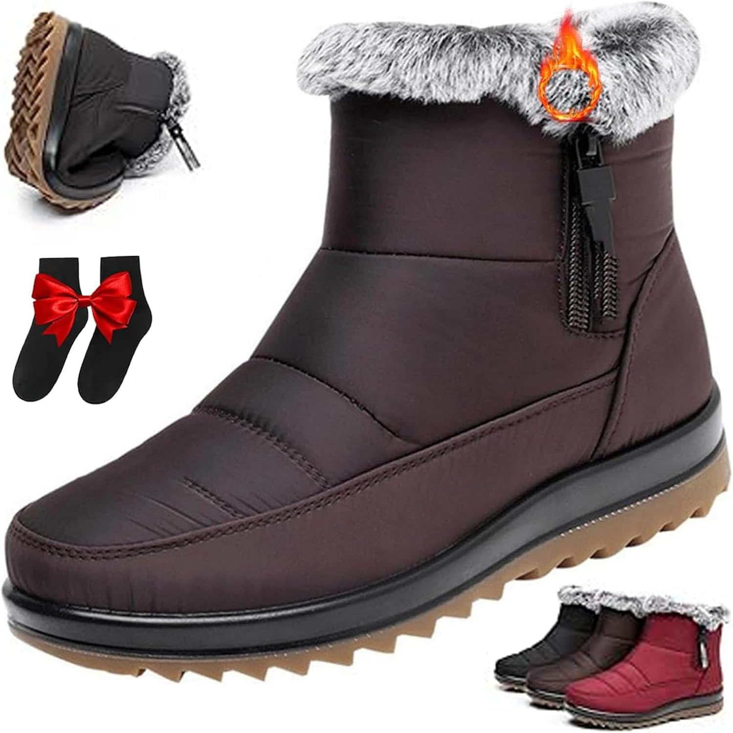 Women's Waterproof Orthopedic Warm Boots with Side Zipper, Winter Outdoor Fur Lined Ankle Booties Women Casual Non-Slip Comfortable Walking Snow ShoesWarm: The soft and plush fur lining offers warmth, keeping your feet cozy in even the cold weatherNon-Slip: The rubber sole offers traction on icy, snowy, or wet surfaces for safeSnow Boots for Women Waterproof: These women winter shoes are made with waterproof upper to keep your feet dry and comfortable in rainy or snowy weatherSide Zipper: Featuring a side zipper, these women's ankle booties are easy to slip on and offOccasion: Suitable for party, walking, vacation, travel, dating, office, work, hiking, shoppingSpecifications:Product Name: Women's Waterproof Orthopedic Warm BootsColors: Red, Black, Dark BrownSuitable Seasons: Spring, Autumn, WinterMaterial: Waterproof Fabric, Fleece Lined, Oxford SoleColor: Red, Black, BrownFunction: Waterproof, non-slip, warmPackage Includes:1 * Women's Winter Waterproof Non-Slip Fleece Snow Boots1 * SocksWomen's Winter Waterproof Non-Slip Fleece Snow Boots Warm Fur Lined Winter Ankle Boots Comfortable Outdoor Fleece Shoes with Zipper