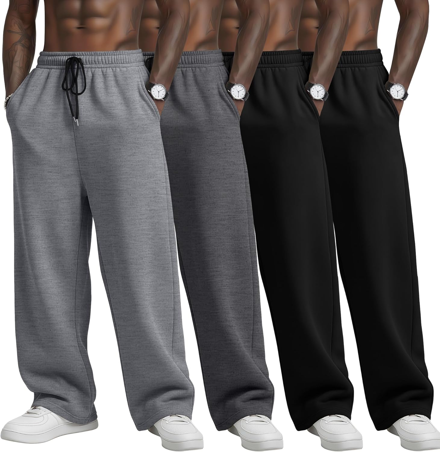 Features: Drawstring sweatpants for men are designed for comfort and everyday wear, featuring a elastic waistband and practical pockets, suitable for casual use, relaxing at home, light exercise, running errands, or weekend outings etc Our men's track pants are available in multiple sizes, please measure your waist and hips according to our size chart and choose the right size of your pants Material: 95% Polyester, 5% Spandex Package includes: 4 X Big and Tall Sweatpants for Men Notes: Manual measurement, please allow slight errors on size. The color may exist a slight difference due to different screen displays