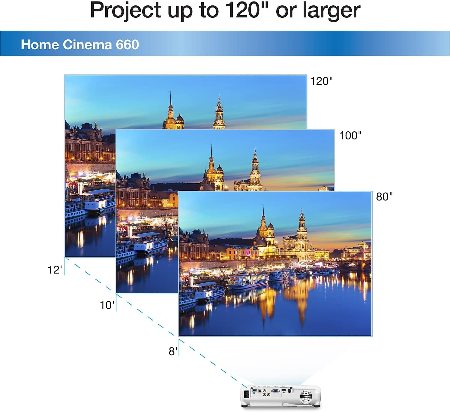 Enjoying big-screen entertainment is easier than ever with the Home Cinema 660 portable projector. Get life-sized images up to 300" — up to 25x larger than a 60" flat panel — for on-demand TV, outdoor movies or multiplayer videogames. It’s simple with all-digital HDMI connectivity. Featuring 3,300 lumens of color/white brightness (1), this projector shines bright. 1. Color brightness (color light output) and white brightness (white light output) will vary depending on usage conditions. Color light output measured in accordance with IDMS 15.4; white light output measured in accordance with ISO 21118. 4. For convenient and reasonable recycling options, visit our official site. 5. SmartWay is an innovative partnership of the U.S. Environmental Protection Agency that reduces greenhouse gases and other air pollutants and improves fuel efficiency.