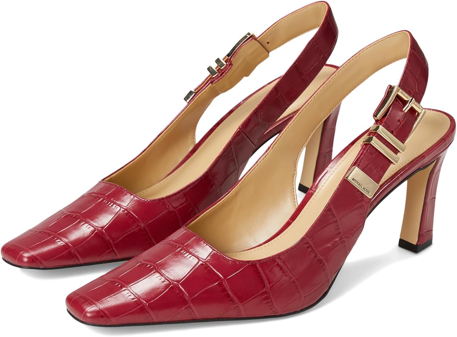 Modern dress slingback pump silhouette featuring on trend squared point toe on fashion heel with distinctive adjustable metal buckle closure.