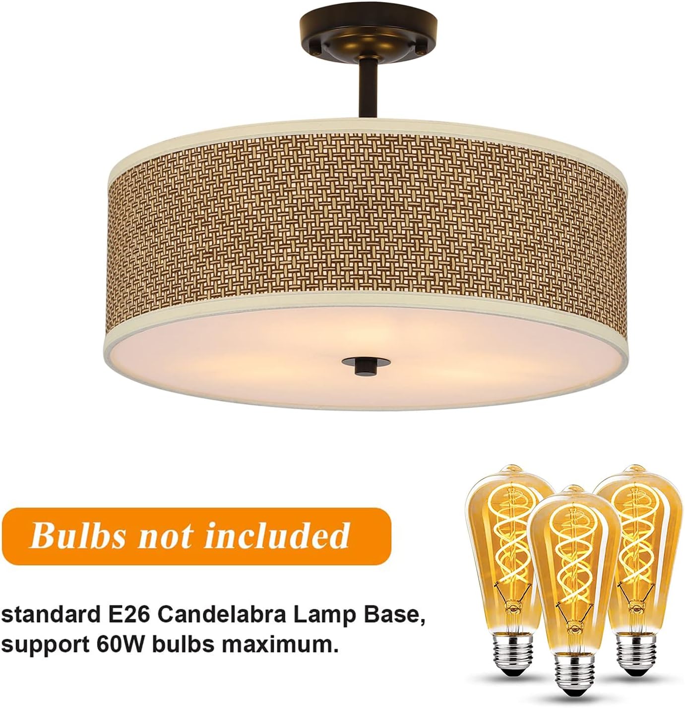 DetailsE26 Bulb Head: This product uses E26 bulbs, which are easy to purchase and assemble.Large Ceiling Tray: This product uses a 4.72in large diameter ceiling tray, which can make the fixture fixed more firmly. ApplicationYou can install this elegant fixture in different areas of your home, such as kitchens, bedrooms, offices, dens, hallways, entrances, foyers, and more. It has a lighting area of 323sq. ft.SpecificationMaterial: Iron, RattanColor: BrownShape: CylindricalStyle: Simple and ModernLamp Form: Ceiling LightLight Source Type: Any Bulb With E26 Bulb Holder Bulb Maximum Wattage: 60WNumber of Light Sources: 3 (Not Included)Surface Finish: ElectroplatingInstallation Type: HangingVoltage: 85-240V 50/60HzIlluminated Area: 30㎡/323sq. ftAdjust Brightness: Compatible with Dimming Lamp and Dimmer SwitchAssembly Required: YesGross Weight: 2.8kg/ 6.17 lbs Net Weight: 2kg/ 4.41 lbsProduct Size(φ&H): 43*32cm/ 16.93*12.59inCeiling Tray Diameter: 12cm/4.72inPackage Size: 45*45*18cm/17.72*17.72*7.09inPackage Included1 * Rattan Semi Flush Ceiling Light Notes1.This product does not include the bulbs, please purchase them yourself.2.This product is not waterproof, please install it in a dry environment.3.Please disconnect the power and wipe with a soft, dry cloth before cleaning the shade or fixture. Please avoid using chemicals and household cleaners as they may damage the finish.4.Products with electrical plugs are designed for use in the US. Please check compatibility before purchasing.5.Please allow the slight color difference caused by the shooting light and the 1-3 cm error due to manual measurement, and make sure you do not mind before ordering.