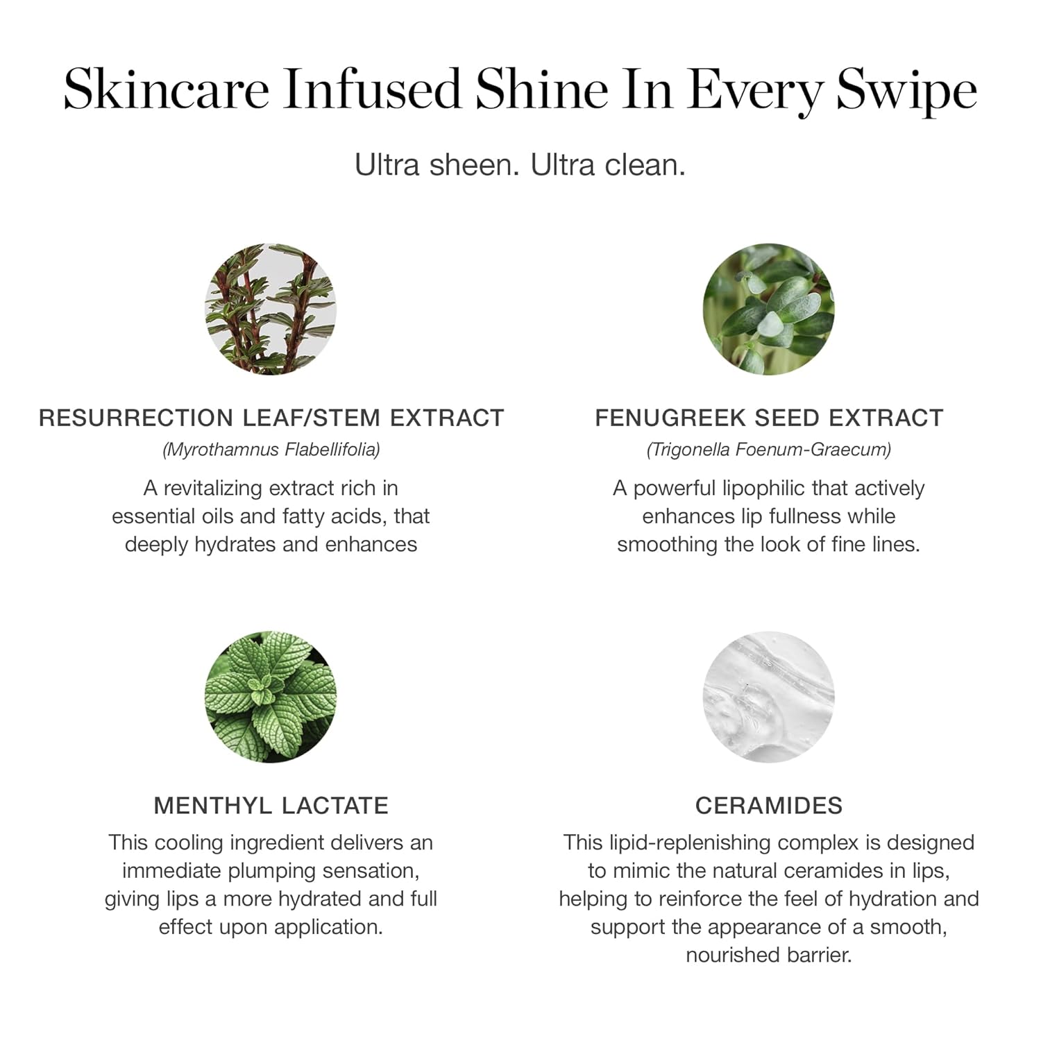 Experience the perfect fusion of skincare and shine with this cushiony, non-sticky lip gloss. Powered by Resurrection Leaf Extract and plant-based oils, the plumping lip gloss visibly plumps and revitalizes lips while smoothing the look of fine lines. Ceramides and natural sugars deliver deep, lasting hydration to support a soft, supple barrier and keep lips feeling nourished all day. A hint of menthyl lactate adds a cooling touch for an instantly fuller effect, while the high-gloss finish leaves a sheer, luminous glow. Formulated without microplastics or synthetic dyes, this clean beauty essential uses only skin-loving botanicals to deliver vibrant color and luxurious moisture—without compromise.