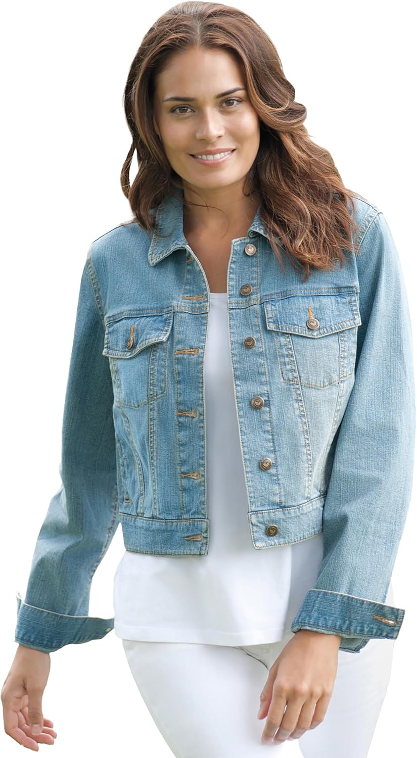 Experience ultimate comfort with our stretch denim fabric, designed for easy movement and a perfect fit. br> Classic denim details with felled seams and flap pockets that never go out of style. br> Versatile layer that effortlessly complements any top in your wardrobe. br> Button cuffs for a customizable look – roll them up for a casual vibe. br> Convenient side pockets to keep your essentials within reach. br> Adjustable button tabs on the hem for a tailored fit. br> Perfect 28" length for a chic, modern silhouette. br> Made from a durable cotton/poly/spandex blend – ideal for all-day wear. br> Easy care, machine washable for ultimate convenience. br> Imported
